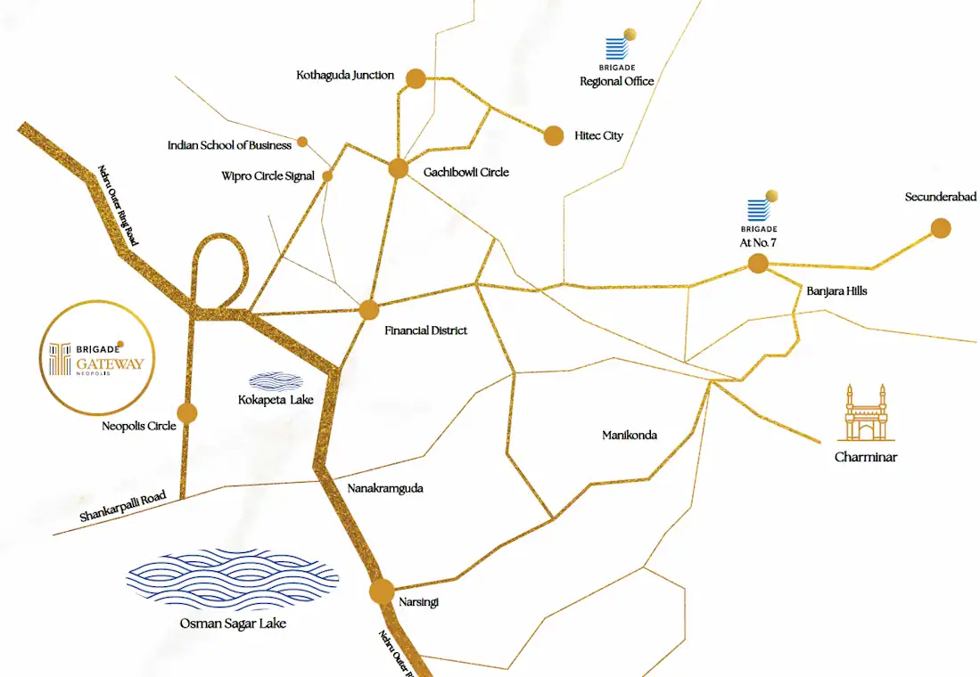 By Brigade Group - At Kokapet, HyderabadBrigade Gateway also known as Brigade Neopolis by Brigade Group in Hyderabad offers luxurious 3, 3.5, 4 BHK & duplex apartments in a 57-floor skyscraper, part of a prime mixed-use development. Located just minutes from top schools, hospitals, and entertainment hubs, residents benefit from seamless access to malls, hotels, and offices. Featuring panoramic decks, Italian marble, VRV/VRF AC, and a 50,000 sq. ft. clubhouse, it’s a city landmark with exceptional investment potential. Proximity to key locations like Rajiv Gandhi Airport (30 mins) and upcoming Neopolis metro station (2 mins) increases the residents' convenience.